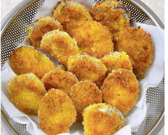 - 4. 완성된 가지튀김은 체에 밭쳐 기름을 충분히 빼주면, 겉바속촉의 정석, 명품 가지튀김이 완성됩니다.