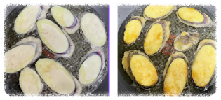 - 1. 1단계 (가루): 물기를 제거한 가지를 **튀김가루(밀가루)**에 가볍게 굴려 얇게 코팅한 뒤, 여분의 가루는 손으로 탁탁 털어냅니다. 이 가루 옷이 가지와 계란물을 연결하는 '접착제' 역할을 합니다.