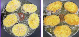 - 3. 앞뒤로 뒤집어가며 약 3~4분간, 튀김옷이 먹음직스러운 황금빛 갈색이 될 때까지 튀겨줍니다.