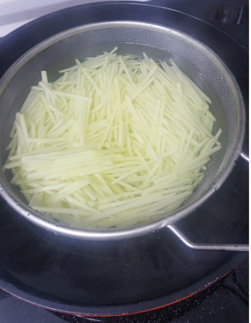- 물이 끓으면 헹궈둔 감자채를 넣습니다.