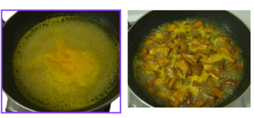 6. 시럽이 바글바글 끓어오르면, 즉시 불을 끄고 튀겨둔 고구마를 모두 넣습니다.