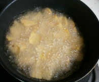 3. 젓가락으로 가장 두꺼운 부분을 찔렀을 때 부드럽게 쑥 들어가고, 겉면이 노릇한 황금빛을 띠면 건져내어 기름을 빼줍니다.