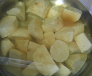 3. 전분 빼기: 썬 고구마는 찬물에 10분 정도 담가 전분기를 빼줍니다. 이 과정을 거쳐야 튀겼을 때 서로 달라붙지 않고, 색이 검게 변하는 것을 막을 수 있습니다.
