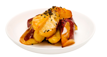- 완성된 맛탕은 넓은 쟁반이나 접시에 서로 달라붙지 않게 펼쳐 한 김 식혀주면, 겉은 바삭하고 속은 촉촉한 명품 고구마 맛탕이 완성됩니다.
