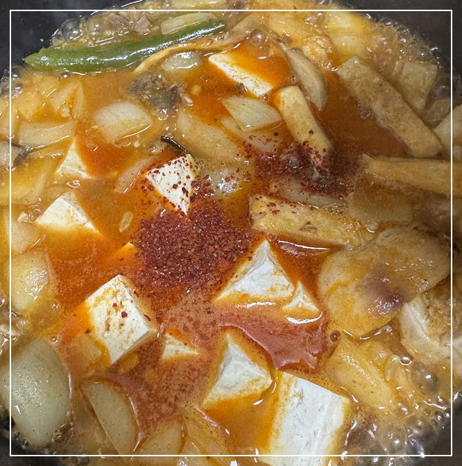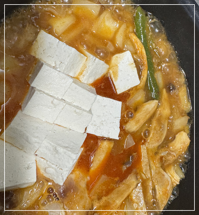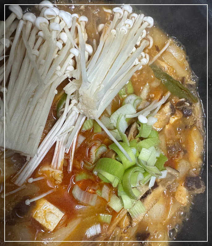 이제 큼직하게 썬 두부를 넣고 한소끔 더 끓여줍니다. 마지막으로 대파와 팽이버섯을 올려 마무리합니다.