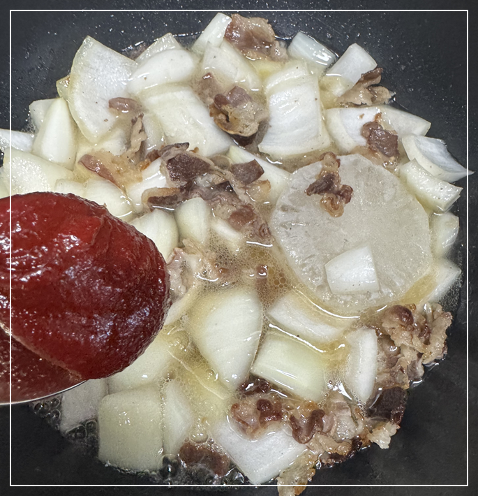 차돌박이에서 고기 기름이 나오기 시작하면 준비한 무를 넣고 함께 볶아 풍미를 입혀줍니다. 여기서 가장 중요한 포인트!
