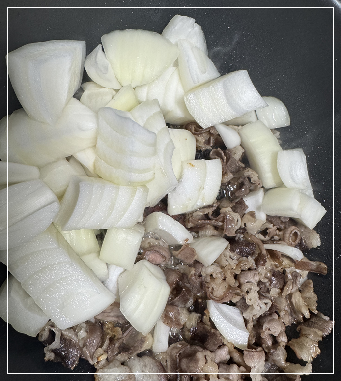냄비에 먹기 좋게 자른 차돌박이와 양파를 먼저 넣고 볶아줍니다.