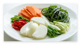 • 고기가 숙성되는 동안, 양파와 당근은 0.5cm 두께로 채 썰고, 대파와 고추는 어슷하게 썹니다. 양배추는 큼직하게, 깻잎은 굵게 채 썰어 준비합니다.