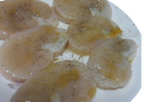 3. 밑간: 굽기 바로 직전, 소금과 후추, 올리브유를 앞뒤로 가볍게 뿌려 밑간을 합니다.