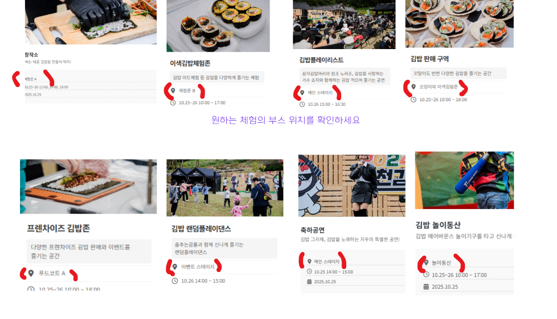 - [중요!] 일부 체험 프로그램 참가 꿀팁: 축제의 메인 이벤트인 '김밥 만들기 체험' 은 김천로컬김밥구역 (로컬푸드존)에서 진행됩니다. ( 10.25~26 10:00 ~ 18:00 )
