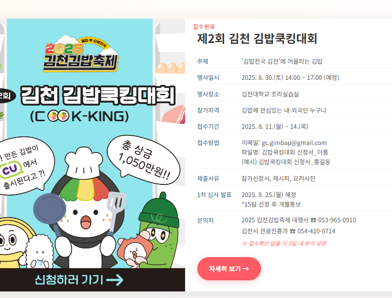 전 국민의 소울푸드 '김밥'을 주제로 펼쳐지는 맛있고 즐거운 축제! 올가을, 김천으로 떠나 맛있는 김밥과 함께 잊지 못할 추억을 만들어보시는 건 어떨까요?