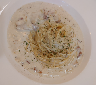 부드럽고 고소한 크림소스가 쫄깃한 면발을 감싸 안은 크림 파스타(까르보나라 또는 알프레도 스타일).