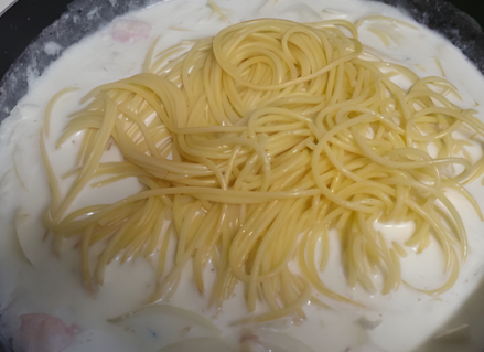 **새우**나 **관자**를 넣으면 고급 해산물 크림 파스타가 됩니다.