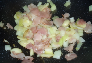 - 팬에 오일을 두르고 마늘, 양파, 베이컨을 볶아 향과 기름을 낸다.