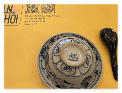안토이의 노란 테마와 잘 어울리는 식기들은 베트남의 유명 도자기 마을인 '밧짱(Bat Trang)' 스타일을 차용한 경우가 많습니다.