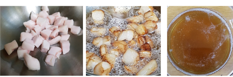 1. (핵심 비법!) 돼지기름 내기: 프라이팬을 중불로 달구고 식용유를 넉넉하게 두른 뒤, 돼지비계나 대패삼겹살을 올려 노릇하게 구워 돼지기름을 내줍니다. 이 돼지기름이 녹두전의 고소한 풍미를 극대화하는 최고의 비법입니다. (바삭하게 익은 삼겹살은 따로 건져두었다가 전 위에 올려 함께 먹어도 맛있습니다.) _ 돼지고기 기름을 라드유라고 합니다.