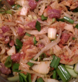 - 속재료 준비: 숙주는 살짝 데쳐 물기를 짜고 송송 썰고, 신김치도 물기를 짜서 송송 썹니다. 다진 돼지고기는 밑간을 해둡니다.