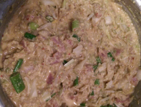 - 갈아둔 녹두 반죽에 준비해둔 모든 속재료(숙주, 김치, 돼지고기, 대파)를 넣고, 소금 두 꼬집 정도로 가볍게 간을 한 뒤 골고루 섞어줍니다. 반죽은 약간 되직한 농도가 정상입니다.