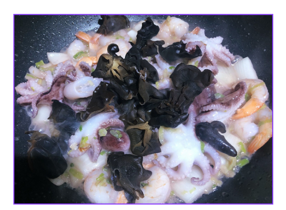 • 4. 해물의 겉면이 익으면, **치킨스톡(육수)**을 붓고 굴소스, 진간장, 설탕, 맛술을 넣어 끓여줍니다.
