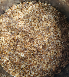 2. 가루 낸 비스킷을 볼에 담고, **전자레인지**에 30초간 돌려 녹인 버터를 부어 골고루 섞어줍니다. (젖은 모래 같은 질감)