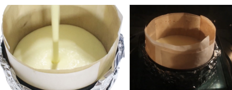 - (핵심!) 케이크 팬 겉면을 **쿠킹포일**로 2~3겹 감싸고, 더 큰 팬에 올린 뒤 **뜨거운 물**을 부어 중탕 환경을 만든다.