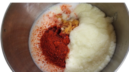 - 찹쌀풀(밀가루풀)을 쑤어 식힌 뒤, 고춧가루, 액젓, 새우젓, 다진 마늘, 생강 등을 섞어 양념장을 만든다.