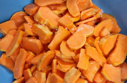 - 넓은 볼에 썬 호박을 담고 굵은소금 4큰술과 설탕 4큰술을 뿌려 골고루 버무려 줍니다.