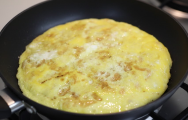 바닥면의 계란이 노릇하게 익어 단단해지고, 윗면의 계란물이 살짝 굳어가면 뒤집습니다.