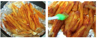 3. 양념 바르기: 초벌 양념한 더덕에 고추장 양념장을 앞뒤로 꼼꼼하게 발라줍니다.