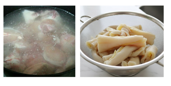 - 1. 도가니는 찬물에 3시간 이상 담가 핏물을 빼고, 끓는 물에 10분간 데쳐(초벌 삶기) 불순물을 제거한다.