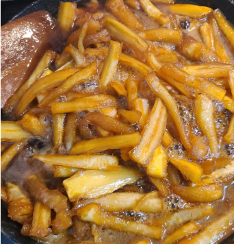 5. 시간이 지나면 도라지가 투명한 갈색빛을 띠고, 전체적으로 수분이 날아가 꾸덕한 조청 형태가 되면 완성입니다. (원하는 농도에 따라 시간을 조절해주세요.)