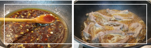 이제 불을 **'중강불'**로 키우고 국물을 졸이기 시작합니다. 숟가락으로 소스를 고기 위에 끼얹어 가며 색을 입혀주세요.