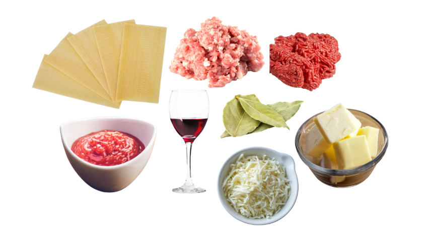 라자냐는 크게 '라구 소스', '베샤멜 소스', 그리고 '조립 재료' 세 부분으로 나뉩니다.