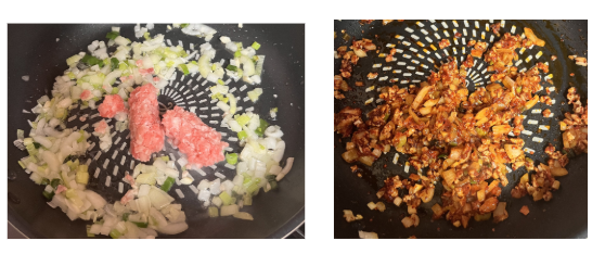 - 팬에 식용유를 두르고 약불에서 다진 대파 , 다진 마늘, 다진 생강을 넣고 볶아 향을 내주세요.