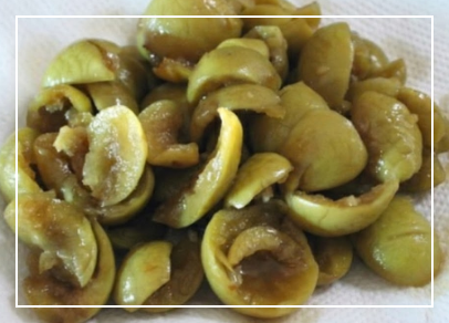 통째로 담근 매실이라면 칼을 이용해 씨를 제거하고 과육만 도려냅니다.