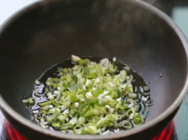 팬에 식용유 3큰술을 두르고 송송 썬 대파를 넣어 먼저 파기름을 냅니다.