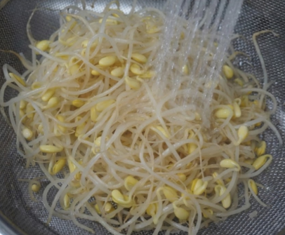 - 콩나물은 흐르는 물에 씻어 껍질을 제거하고 체에 밭칩니다.