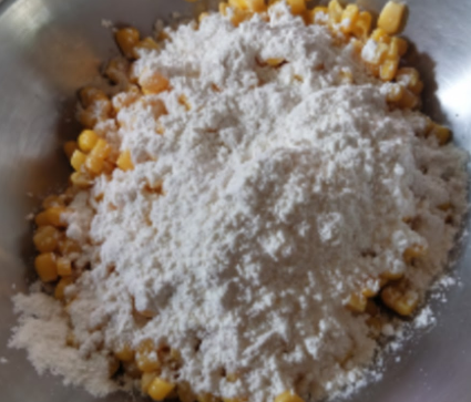 볼에 물기 뺀 옥수수를 담고 튀김가루 4~5큰술을 넣습니다.