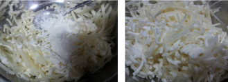 • 3. 위생장갑을 낀 손으로, 모든 재료가 골고루 섞이고, 전분과 치즈가 감자채에 코팅되도록 가볍게 버무려 줍니다. (오래 주무르면 다시 물이 생길 수 있으니 가볍게!)
