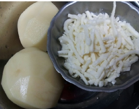 1. 감자는 **채칼**을 이용해 가늘게 채 썬다.