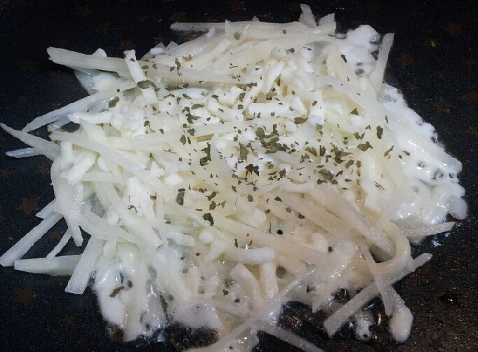 - 3. (핵심 비법 ③) 꾹꾹 누르기: 중약불로 줄인 뒤, 뒤집개로 반죽을 꾹꾹 눌러가며 감자채와 치즈가 서로 엉겨 붙도록 합니다.