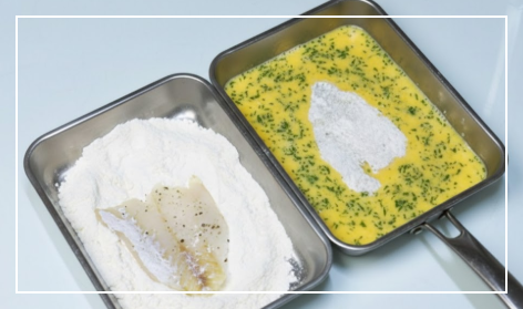 비닐봉지에 부침가루를 넣고 동태포를 넣어 흔들거나 하면 생선이 다 부서져요. 쟁반에서 앞뒤로 묻혀줍니다.
