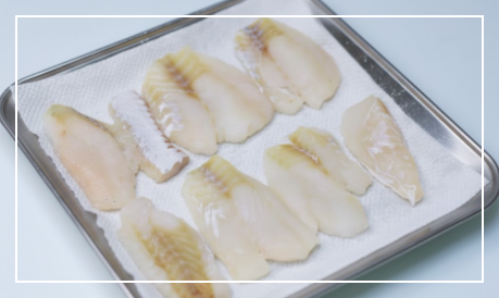 해동된 동태포를 건져 체에 밭친 뒤, 키친타월 위에 올려 물기를 앞뒤로 꾹꾹 눌러 닦아줍니다.