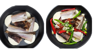 3. 코다리 올리고 양념 붓기: 반쯤 익은 무 위에 손질해둔 코다리를 올립니다. 그 위로 만들어둔 양념장을 골고루 끼얹어 줍니다.