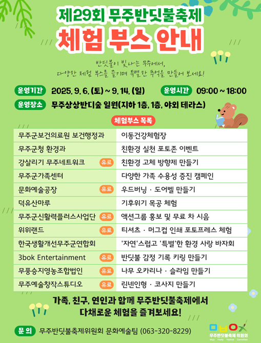 소이나루공원을 배경으로 풀벌레 소리와 함께 반딧불이의 밤을 즐기는 프로그램입니다. 하루 120명씩, 총 480명 참여 가능하며 1인당 5,000원, 역시 온라인 선착순 예약이 필요해요. - 다른 체험 프로그램도 다양해요