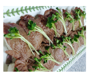 - 소고기는 키친타월로 핏물을 가볍게 제거한 뒤, 초밥을 덮을 수 있는 크기로 0.2~0.3cm 정도의 얇은 두께로 썰어줍니다.