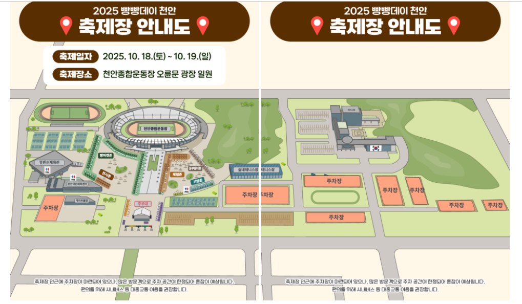 제가 오늘, 축제가 열리는 천안종합운동장 주차장을 기본으로, 만차 시를 대비한 주변의 '꿀 주차장' 정보까지!