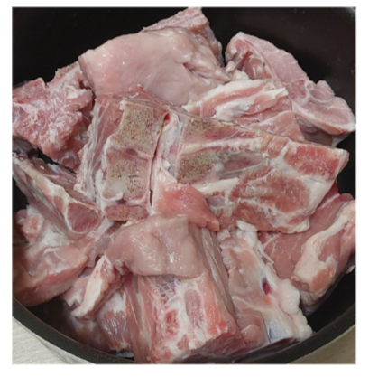 - 깨끗하게 씻은 냄비에, 깨끗하게 씻은 돼지 등뼈를 다시 담습니다.