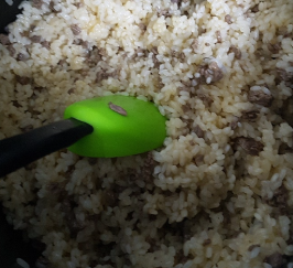 - 고기가 반쯤 익어 핏기가 가시면, 물기를 뺀 **불린 쌀**을 모두 넣습니다. (찬밥 사용 시 찬밥 투입)