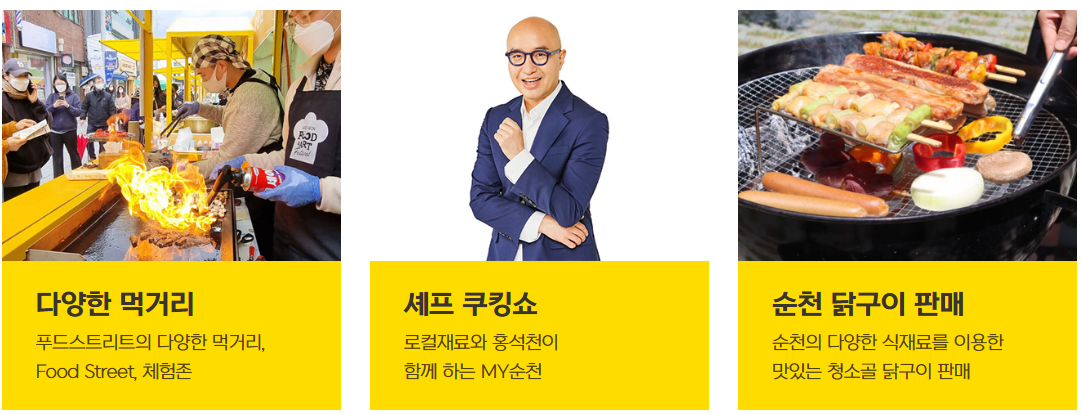 - '셰프의 레스토랑' & '골목식당' 이것이 이 축제의 핵심입니다! 평소 줄 서서 먹어야 했던 순천 원도심의 '숨은 맛집(골목식당)' 셰프들이 직접 거리로 나옵니다. 레스토랑의 대표 메뉴를 축제에 맞게 재해석하여, 합리적인 가격에 선보입니다. 단순히 음식을 파는 것을 넘어, 셰프의 철학과 순천의 식재료를 어떻게 풀어냈는지 '요리'의 관점에서 맛보는 즐거움이 있습니다.